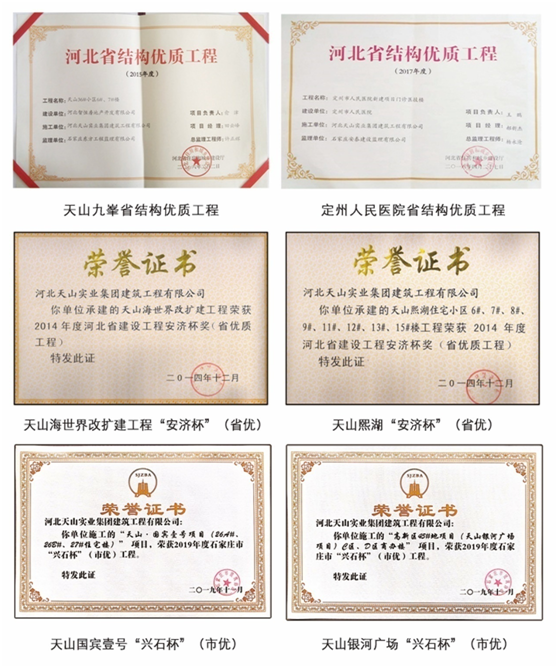 坚持“无字碑”精神,天山建筑公司获得诸多荣誉。自1992年以来,已创出国家建设部、省级、市级优质工程及优质样板工程200余项,实现连续十年单位竣工工程优良率100%。先后荣获“国家优质工程奖”、“全国集体建筑企业全面质量管理优秀奖——金屋奖”、“全国实施用户满意工程先进单位”、“全国用户满意工程”、“河北省质量管理奖”、“建筑安全生产先进单位”、“重合同守信用企业”、“金马奖”、“金球奖”、等多项荣誉称号,创造了建筑界的奇迹。