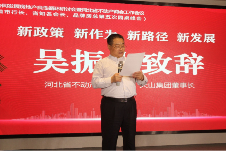 河北省不动产商会会长、天山集团董事长吴振山在致辞中表示今天的主题是新政策、新作为、新路径、新发展。这也是我们在新的发展阶段积极研讨新的发展模式,促进房地产行业,良性健康发展的具体举措。今年以来,国务院和相关部委,多次提出要稳房价、稳地价,促进房地产行业健康发展。今天,我们请到了相关的政府领导、专家老师和行业精英,大家共同来探讨当前房地产行业的发展趋势,进一步提升我们行业、我们商会的创新力和执行力,推动行业的高质量发展。